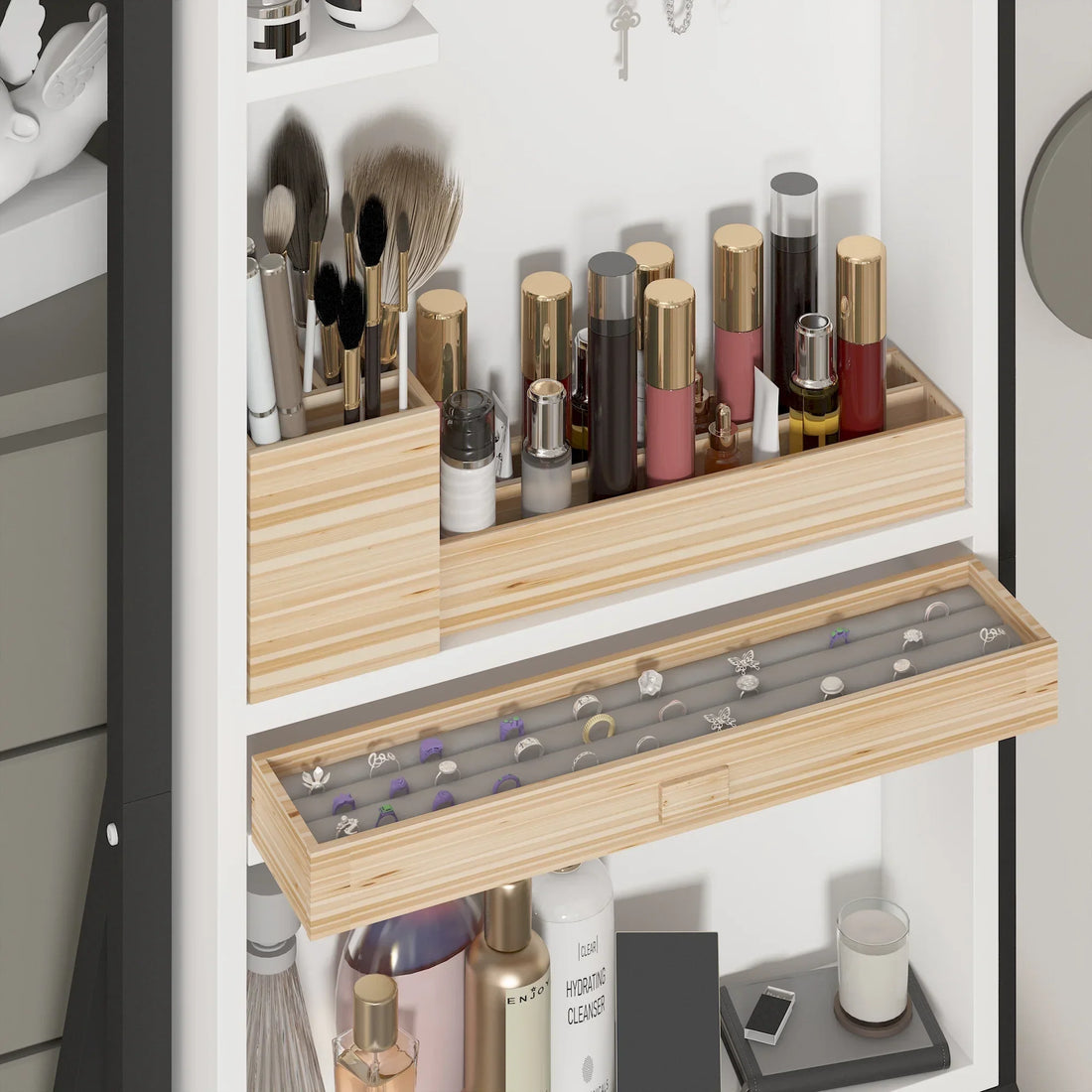 خزانة مجوهرات وماكياج ومرآة تدور 360 درجة مع درجين سفليين، تدور بحرية، مساحة تخزين واسعة، مطلية يدويًا وبلمسة نهائية بيضاء حرفية