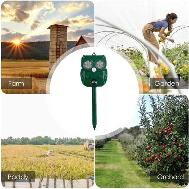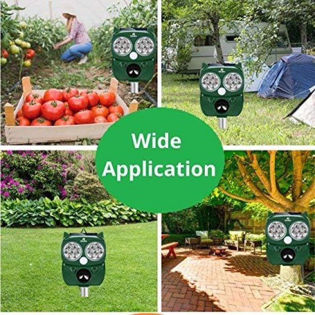 - كيف يعمل: يكتشف مستشعر الحركة المنشط PIR الحيوانات المتحركة ويطلق أضواء LED القوية الوامضة وصوت التنبيه الذي يخيف الحيوانات.